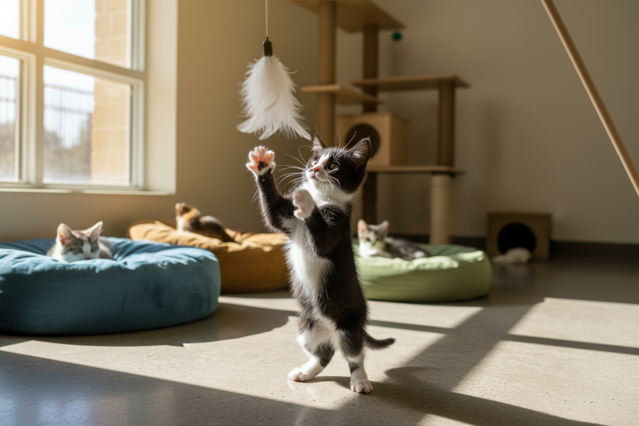 Meet Tiger, a striking tabby boy with bold, tiger-like stripes and a confident little swagger to match. His sleek coat and bright golden eyes give him a wild look, but his personality is pure sweetness. Tiger is playful and athletic,he loves climbing, chasing wand toys, and showing off his impressive pounce.