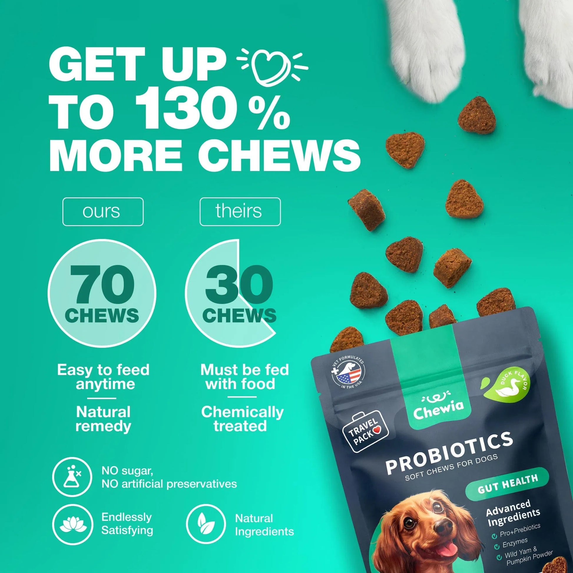 - suitable for every dog: our sugar-free, soft probiotic treats in delectable duck flavor cater to all breeds, sizes, and ages. your furry friend will adore our puppy probiotic chews!